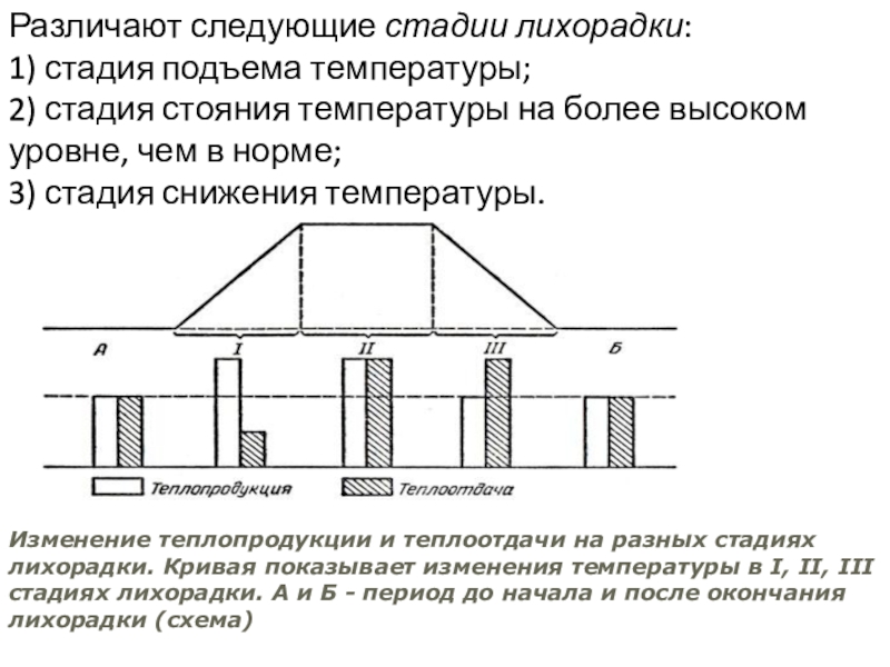 Изменение теплопродукции и теплоотдачи на разных стадиях лихорадки. Кривая показывает изменения температуры в I, II, III стадиях лихорадки. А и Б - период до начала и после окончания лихорадки (схема)