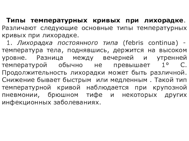 1. Лихорадка постоянного типа (febris continua) - температура тела, поднявшись, держится на высоком уровне. Разница между вечерней и утренней температурой обычно не превышает 1° С. Продолжительность лихорадки может быть различной. Снижение бывает быстрым или медленным . Такой тип температурной кривой наблюдается при крупозной пневмонии, брюшном тифе и некоторых других инфекционных заболеваниях.