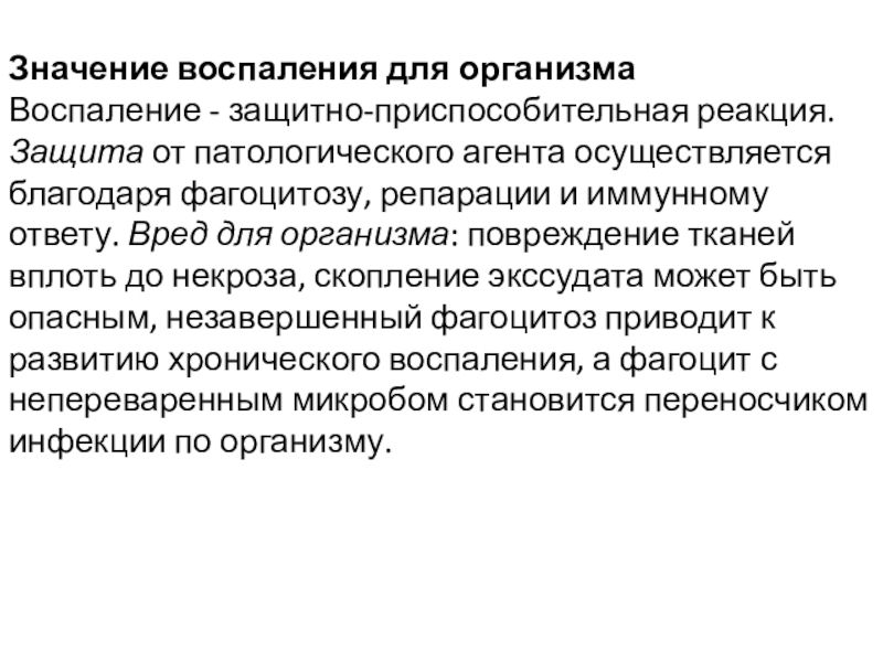 осуществляется благодаря фагоцитозу, репарации и иммунному ответу. Вред для организма: повреждение тканей вплоть до некроза, скопление экссудата может быть опасным, незавершенный фагоцитоз приводит к развитию хронического воспаления, а фагоцит с непереваренным микробом становится переносчиком инфекции по организму.