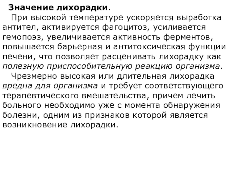 усиливается гемопоэз, увеличивается активность ферментов, повышается барьерная и антитоксическая функции печени, что позволяет расценивать лихорадку как полезную приспособительную реакцию организма.