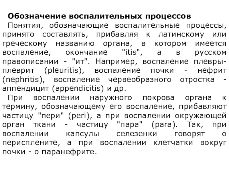 или греческому названию органа, в котором имеется воспаление, окончание "itis", а в русском правописании - "ит". Например, воспаление плевры-плеврит (pleuritis), воспаление почки - нефрит (nephritis), воспаление червеобразного отростка - аппендицит (appendicitis) и др.