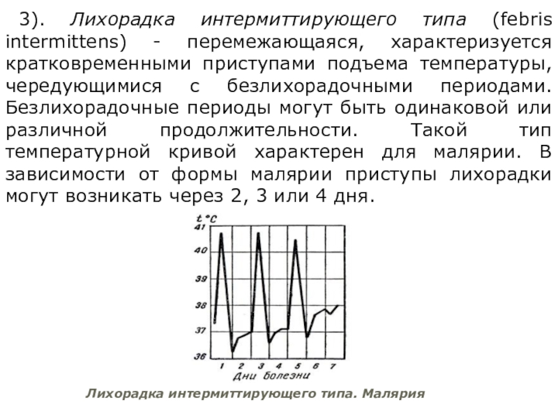подъема температуры, чередующимися с безлихорадочными периодами. Безлихорадочные периоды могут быть одинаковой или различной продолжительности. Такой тип температурной кривой характерен для малярии. В зависимости от формы малярии приступы лихорадки могут возникать через 2, 3 или 4 дня.