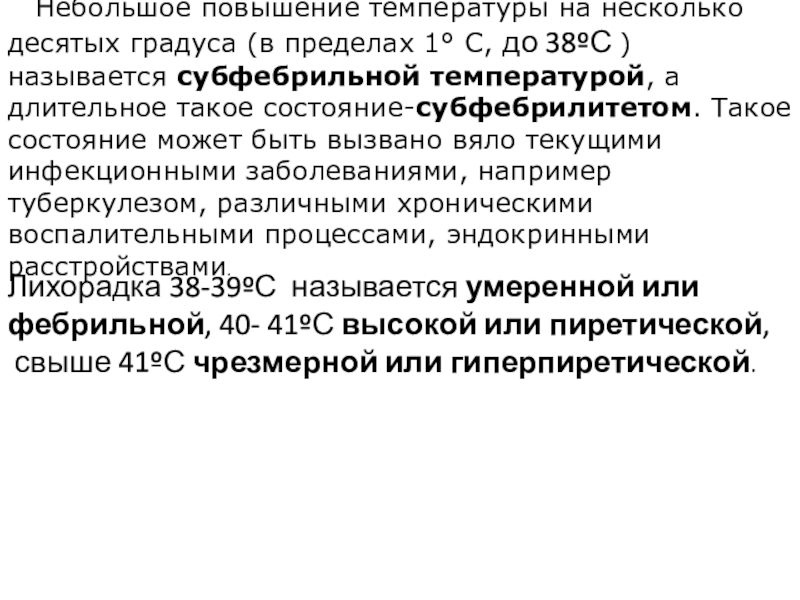 С, до 38ºС ) называется субфебрильной температурой, а длительное такое состояние-субфебрилитетом. Такое состояние может быть вызвано вяло текущими инфекционными заболеваниями, например туберкулезом, различными хроническими воспалительными процессами, эндокринными расстройствами.