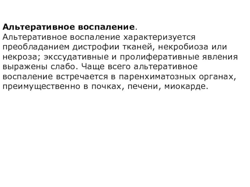экссудативные и пролиферативные явления выражены слабо. Чаще всего альтеративное воспаление встречается в паренхиматозных органах, преимущественно в почках, печени, миокарде.