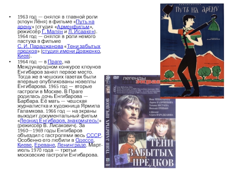 1963 год — снялся в главной роли (клоун Лёня) в фильме «Путь на арену» (студия «Арменфильм», режиссёр Г.