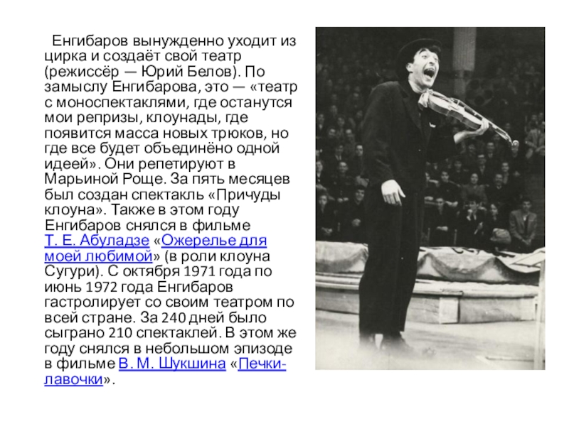 Слайд 5 Енгибаров вынужденно уходит из цирка и создаёт свой театр (режиссёр — Юрий