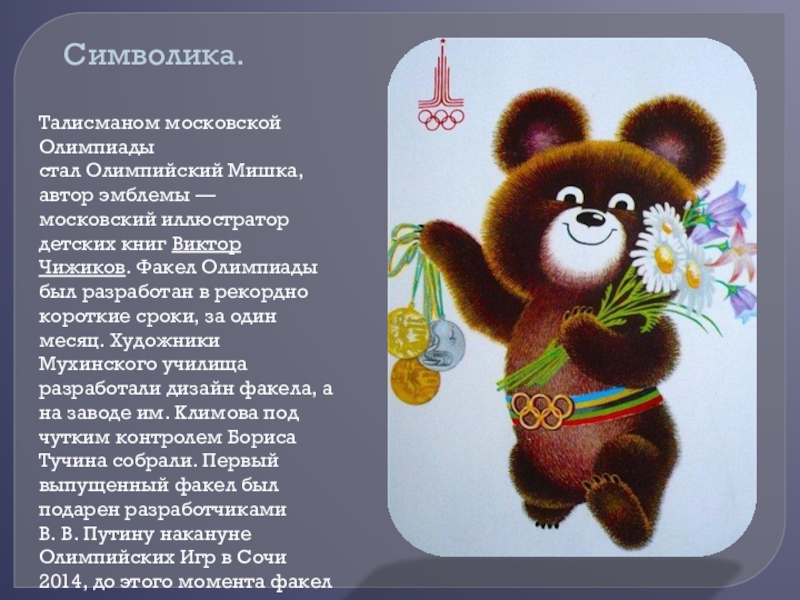 Талисманом московской Олимпиады стал Олимпийский Мишка, автор эмблемы — московский иллюстратор детских книг Виктор