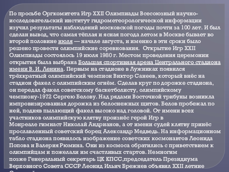 изучил результаты наблюдений московской погоды почти за 100 лет. И был сделан вывод, что самая тёплая и ясная погода летом в Москве бывает во второй половине июля — начале августа, и именно в эти сроки было решено провести олимпийские соревнования. Открытие Игр XXII Олимпиады состоялось 19 июля 1980 г. Местом проведения церемонии открытия была выбрана Большая спортивная арена Центрального стадиона имени В. И. Ленина. Первым на стадионе в Лужниках появился трёхкратный олимпийский чемпион Виктор Санеев, который внёс на стадион факел с олимпийским огнём. Сделав круг по дорожке стадиона, он передал факел советскому баскетболисту, олимпийскому чемпиону-1972 Сергею Белову. Над рядами Восточной трибуны возникла импровизированная дорожка из белоснежных щитов. Белов пробежал по ней, подняв пылающий факел высоко над головой. От имени всех участников олимпийскую клятву произнёс герой Игр в Монреале гимнаст Николай Андрианов, а от имени судей клятву принёс прославленный советский борец Александр Медведь. На информационном табло стадиона появилось изображение советских космонавтов Леонида Попова и Валерия Рюмина. Они из космоса обратились с приветствием к олимпийцам и пожелали им счастливых стартов. Немногим позже Генеральный секретарь ЦК КПСС,председатель Президиума Верховного Совета СССР Леонид Ильич Брежнев объявил XXII летние Олимпийские игры открытыми.