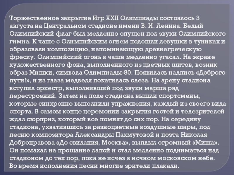 Слайд 10Торжественное закрытие Игр XXII Олимпиады состоялось 3 августа на Центральном стадионе имени В. И. Ленина.