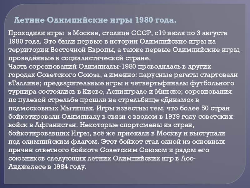 Часть соревнований Олимпиады-1980 проводилась в других городах Советского Союза, а именно: парусные регаты стартовали вТаллине; предварительные игры и четвертьфиналы футбольного турнира состоялись в Киеве, Ленинграде и Минске; соревнования по пулевой стрельбе прошли на стрельбище «Динамо» в подмосковных Мытищах. Игры известны тем, что более 50 стран бойкотировали Олимпиаду в связи с вводом в 1979 году советских войск в Афганистан. Некоторые спортсмены из стран, бойкотировавших Игры, всё же приехали в Москву и выступали под олимпийским флагом. Этот бойкот стал одной из основных причин ответного бойкота Советским Союзом и рядом его союзников следующих летних Олимпийских игр в Лос-Анджелесе в 1984 году.