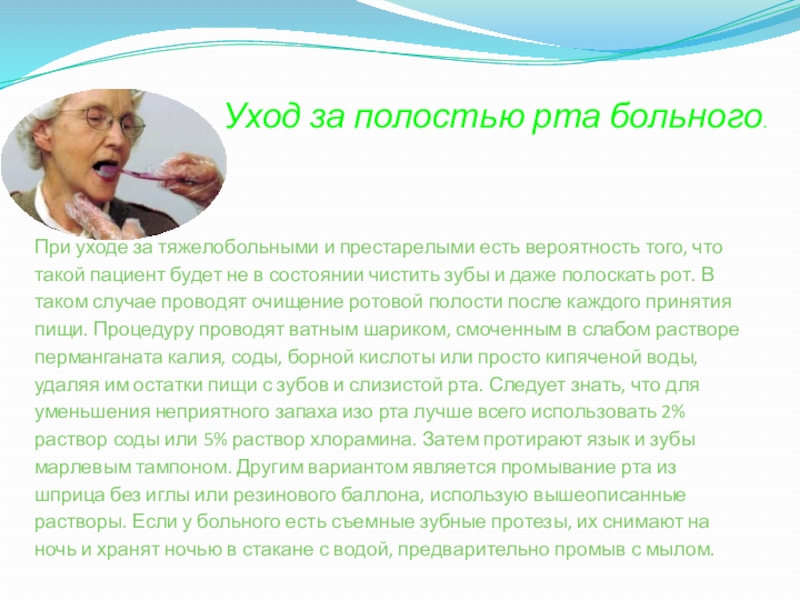 вероятность того, что такой пациент будет не в состоянии чистить зубы и даже полоскать рот. В таком случае проводят очищение ротовой полости после каждого принятия пищи. Процедуру проводят ватным шариком, смоченным в слабом растворе перманганата калия, соды, борной кислоты или просто кипяченой воды, удаляя им остатки пищи с зубов и слизистой рта. Следует знать, что для уменьшения неприятного запаха изо рта лучше всего использовать 2% раствор соды или 5% раствор хлорамина. Затем протирают язык и зубы марлевым тампоном. Другим вариантом является промывание рта из шприца без иглы или резинового баллона, использую вышеописанные растворы. Если у больного есть съемные зубные протезы, их снимают на ночь и хранят ночью в стакане с водой, предварительно промыв с мылом.