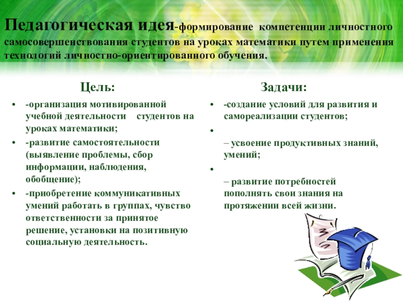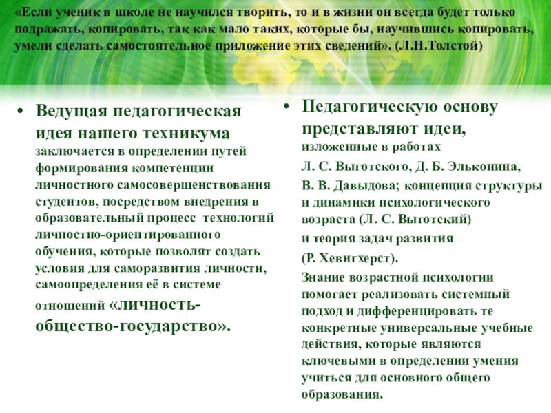 Ведущая педагогическая идея нашего техникума заключается в определении путей формирования компетенции личностного самосовершенствования студентов, посредством внедрения в образовательный процесс технологий личностно-ориентированного обучения, которые позволят создать условия для саморазвития личности, самоопределения её в системе отношений «личность-общество-государство».