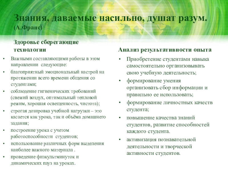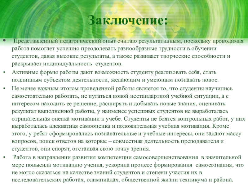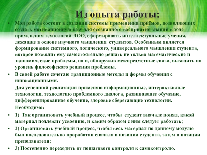 Моя работа состоит в создании системы применения приёмов, позволяющих создать мотивационную базу для осознанного восприятия знаний в ходе применения технологий ЛОО, сформировать интеллектуальные умения, лежащие в основе научного мышления студентов. Особенным является формирование системного, логического, универсального мышления студента, которое позволит ему самостоятельно решать не только математические и экономические проблемы, но и, обнаружив межпредметные связи, выходить на уровень философского решения проблемы.