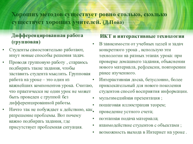 В своей работе сочетаю традиционные методы и формы обучения с инновационными.