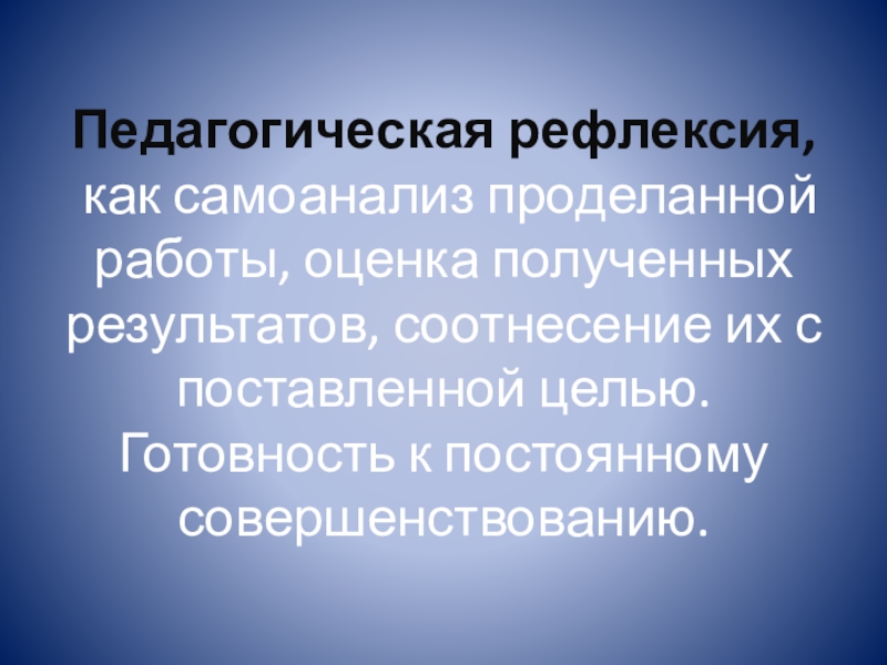 Слайд 8Педагогическая рефлексия, как самоанализ проделанной работы, оценка полученных результатов, соотнесение их