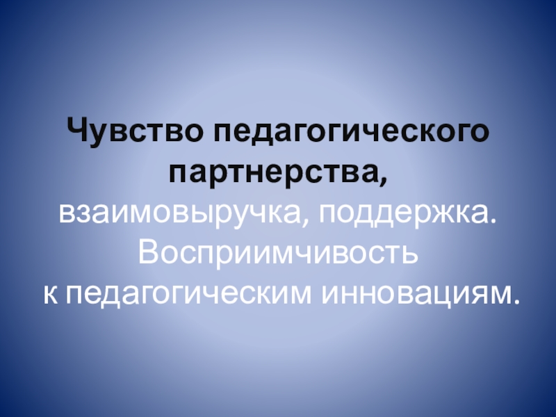 Слайд 5Чувство педагогического партнерства, взаимовыручка, поддержка. Восприимчивость к педагогическим инновациям.