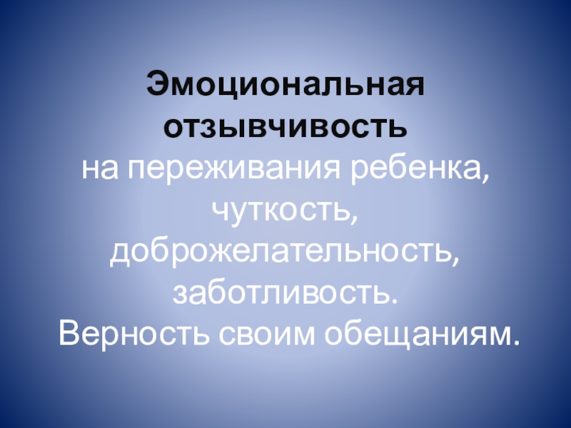 Слайд 3Эмоциональная отзывчивость на переживания ребенка, чуткость, доброжелательность, заботливость. Верность своим обещаниям.
