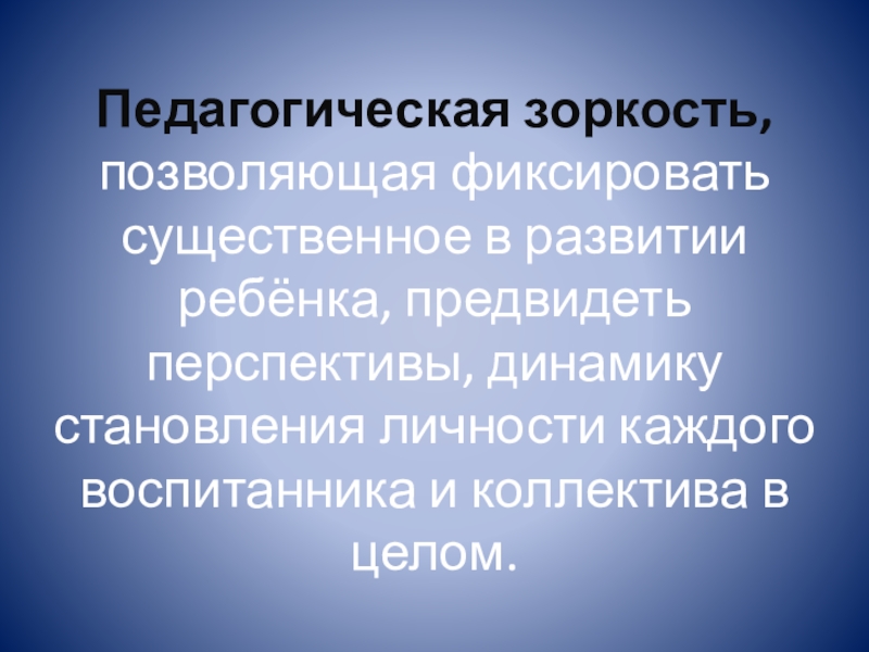 Педагогическая зоркость, позволяющая фиксировать существенное в развитии ребёнка, предвидеть перспективы, динамику становления личности каждого воспитанника и коллектива