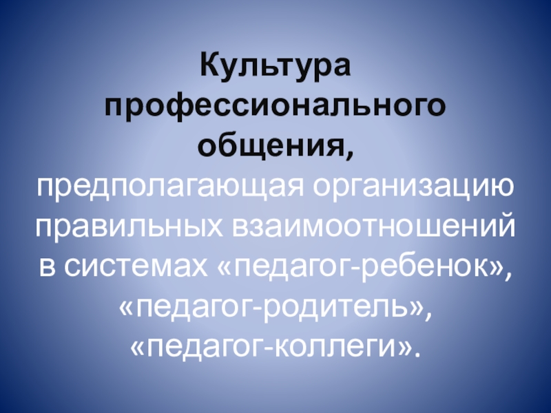 Слайд 7Культура профессионального общения, предполагающая организацию правильных взаимоотношений в системах «педагог-ребенок», «педагог-родитель»,