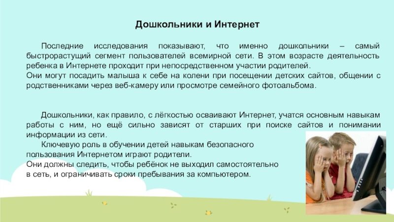 Дошкольники, как правило, с лёгкостью осваивают Интернет, учатся основным навыкам работы с ним, но ещё сильно зависят от старших при поиске сайтов и понимании информации из сети.