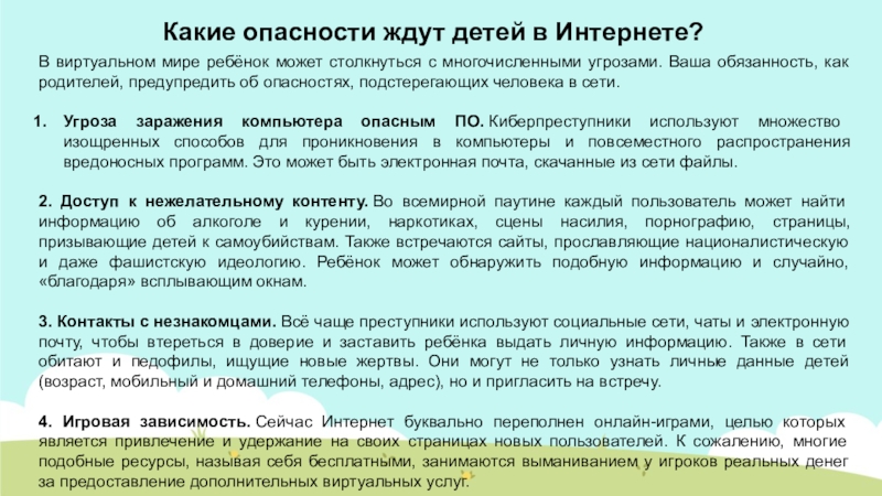 с многочисленными угрозами. Ваша обязанность, как родителей, предупредить об опасностях, подстерегающих человека в сети.