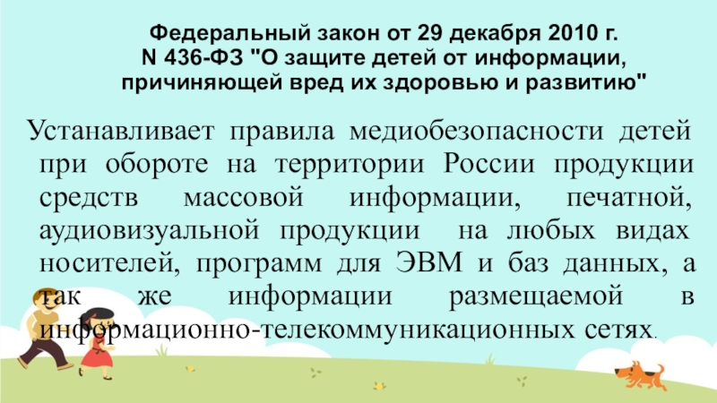 Устанавливает правила медиобезопасности детей при обороте на территории России продукции средств массовой информации, печатной, аудиовизуальной продукции на любых видах носителей, программ для ЭВМ и баз данных, а так же информации размещаемой в информационно-телекоммуникационных сетях.