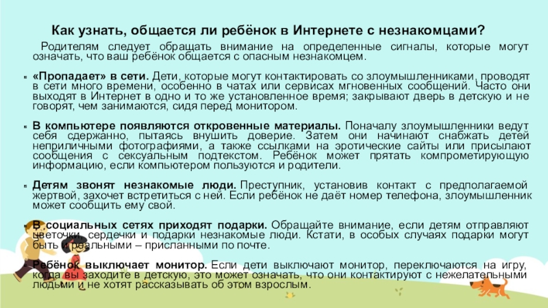внимание на определенные сигналы, которые могут означать, что ваш ребёнок общается с опасным незнакомцем.