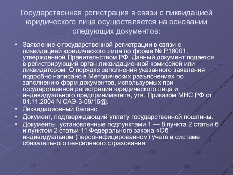 Заявление о государственной регистрации в связи с ликвидацией юридического лица по форме № Р16001, утвержденной Правительством РФ. Данный документ подается в регистрирующий орган ликвидационной комиссией или ликвидатором. О порядке заполнения указанного заявления подробно написано в Методических разъяснениях по заполнению форм документов, используемых при государственной регистрации юридического лица и индивидуального предпринимателя, утв. Приказом МНС РФ от 01.11.2004 N САЭ-3-09/16@.