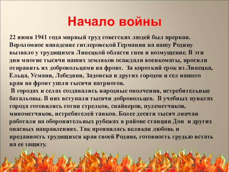 Вероломное нападение гитлеровской Германии на нашу Родину вызвало у трудящихся Липецкой области гнев и возмущение. В эти дни многие тысячи наших земляков осаждали военкоматы, просили отправить их добровольцами на фронт. За короткий срок из Липецка, Ельца, Усмани, Лебедяни, Задонска и других городов и сел нашего края на фронт ушли тысячи патриотов.