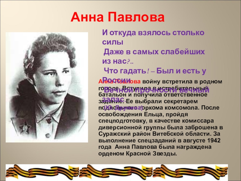 и получила ответственное задание. Ее выбрали секретарем подпольного горкома комсомола. После освобождения Ельца, пройдя спецподготовку, в качестве комиссара диверсионной группы была заброшена в Суражский район Витебской области. За выполнение спецзаданий в августе 1942 года Анна Павлова была награждена орденом Красной Звезды.