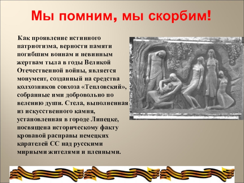 патриотизма, верности памяти погибшим воинам и невинным жертвам тыла в годы Великой Отечественной войны, является монумент, созданный на средства колхозников совхоза «Тепловский», собранные ими добровольно по велению души. Стела, выполненная из искусственного камня, установленная в городе Липецке, посвящена историческому факту кровавой расправы немецких карателей СС над русскими мирными жителями и пленными.