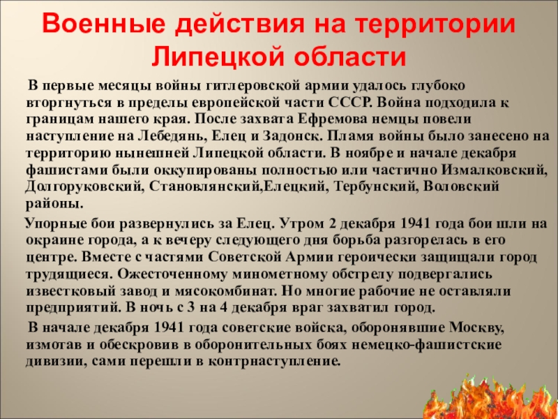 месяцы войны гитлеровской армии удалось глубоко вторгнуться в пределы европейской части СССР. Война подходила к границам нашего края. После захвата Ефремова немцы повели наступление на Лебедянь, Елец и Задонск. Пламя войны было занесено на территорию нынешней Липецкой области. В ноябре и начале декабря фашистами были оккупированы полностью или частично Измалковский, Долгоруковский, Становлянский,Елецкий, Тербунский, Воловский районы.