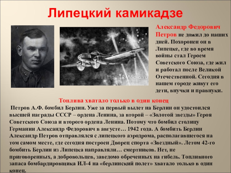 Петров А.Ф. бомбил Берлин. Уже за первый вылет на Берлин он удостоился высшей награды СССР – ордена Ленина, за второй – «Золотой звезды» Героя Советского Союза и второго ордена Ленина. Потому что бомбил столицу Германии Александр Федорович в августе… 1942 года. А бомбить Берлин Александр Петров отправлялся с липецкого аэродрома, располагавшегося на том самом месте, где сегодня построен Дворец спорта «Звездный». Летом 42-го бомбить Берлин из Липецка направляли… смертников. Нет, не приговоренных, а добровольцев, заведомо обреченных на гибель. Топливного запаса бомбардировщика ИЛ-4 на «берлинский полет» хватало только в один конец.