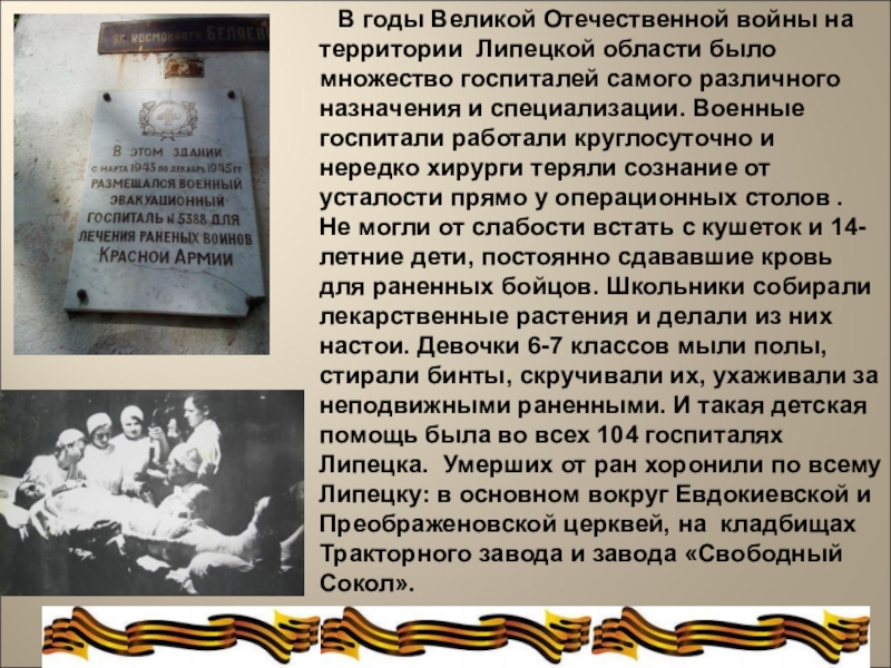 территории Липецкой области было множество госпиталей самого различного назначения и специализации. Военные госпитали работали круглосуточно и нередко хирурги теряли сознание от усталости прямо у операционных столов . Не могли от слабости встать с кушеток и 14-летние дети, постоянно сдававшие кровь для раненных бойцов. Школьники собирали лекарственные растения и делали из них настои. Девочки 6-7 классов мыли полы, стирали бинты, скручивали их, ухаживали за неподвижными раненными. И такая детская помощь была во всех 104 госпиталях Липецка. Умерших от ран хоронили по всему Липецку: в основном вокруг Евдокиевской и Преображеновской церквей, на кладбищах Тракторного завода и завода «Свободный Сокол».