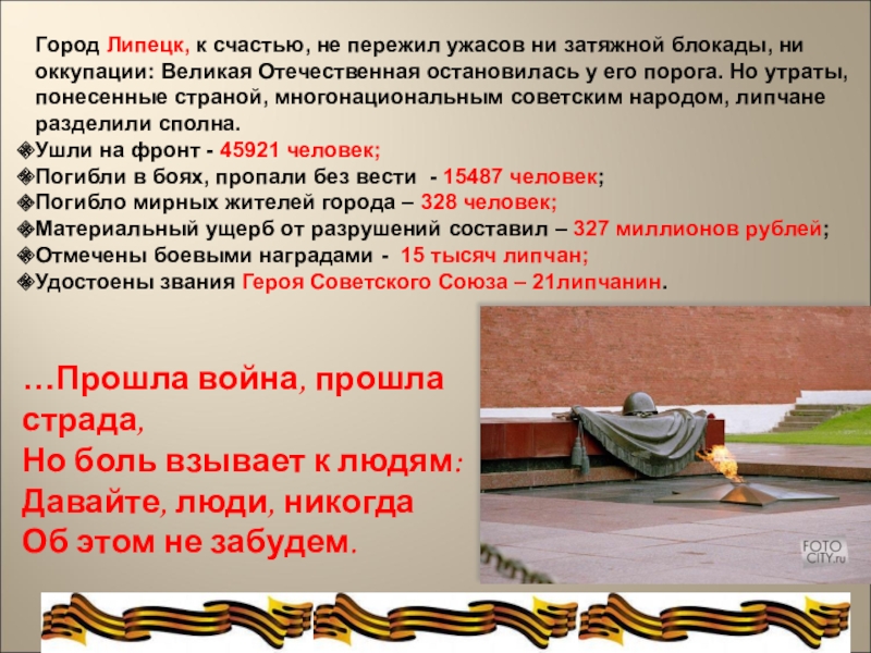 Слайд 30Город Липецк, к счастью, не пережил ужасов ни затяжной блокады, ни