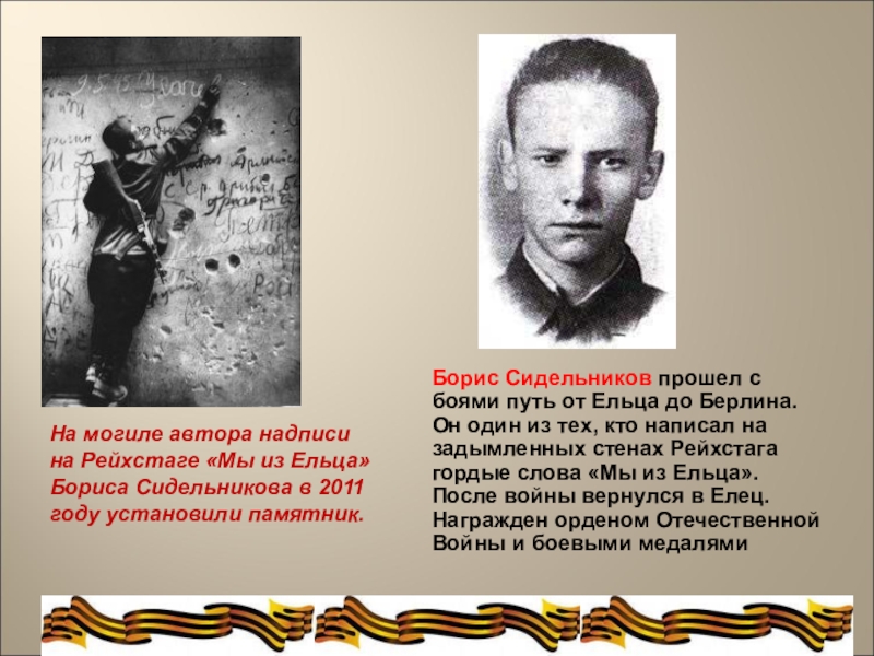 Слайд 23На могиле автора надписи на Рейхстаге «Мы из Ельца» Бориса Сидельникова
