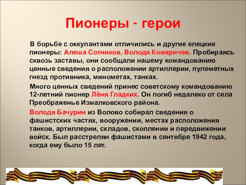 и другие елецкие пионеры: Алеша Сотников, Володя Комаричев. Пробираясь сквозь заставы, они сообщали нашему командованию ценные сведения о расположении артиллерии, пулеметных гнезд противника, минометах, танках.