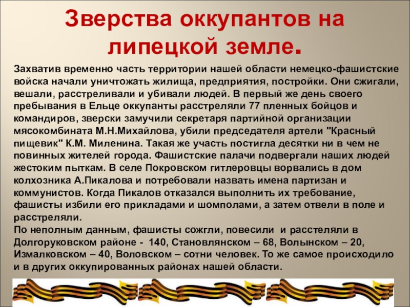 По неполным данным, фашисты сожгли, повесили и расстеляли в Долгоруковском районе - 140, Становлянском – 68, Волынском – 20, Измалковском – 40, Воловском – сотни человек. То же самое происходило и в других оккупированных районах нашей области.