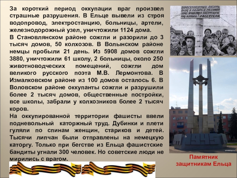 Слайд 11За короткий период оккупации враг произвел страшные разрушения. В Ельце вывели