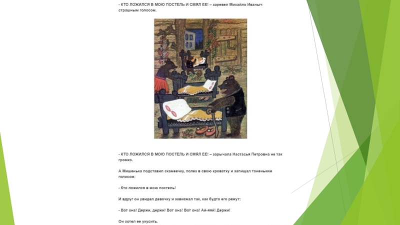 ней отсутствует: вот забрела несчастная Маша в чужую избушку, отдохнула, а тут вернулись медведи и ее напугали. Но девочке удалось убежать… Настораживает только поведение главной героини. Ведет себя маленькая девочка нескромно в чужом жилище… Итак, чему учит эта сказка?