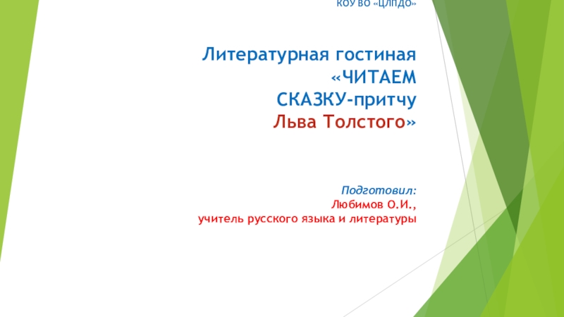 Слайд 1 КОУ ВО «ЦЛПДО» Литературная гостиная «ЧИТАЕМ СКАЗКУ-притчу Льва Толстого» Подготовил: Любимов О.И., учитель русского языка и литературы