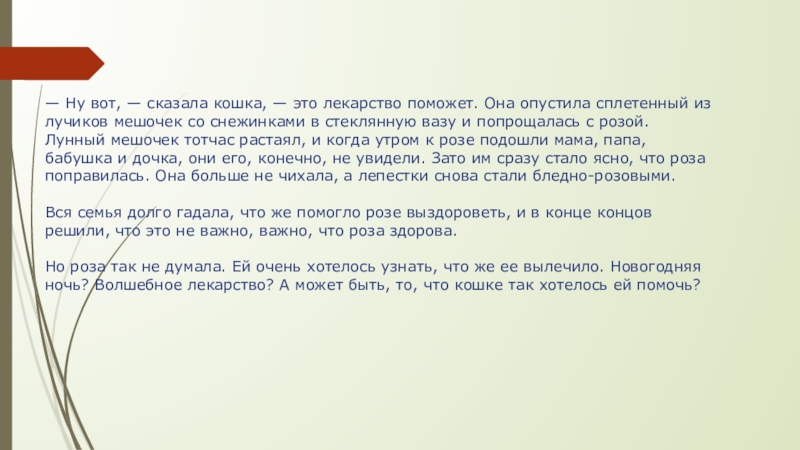 Но роза так не думала. Ей очень хотелось узнать, что же ее вылечило. Новогодняя ночь? Волшебное лекарство? А может быть, то, что кошке так хотелось ей помочь?