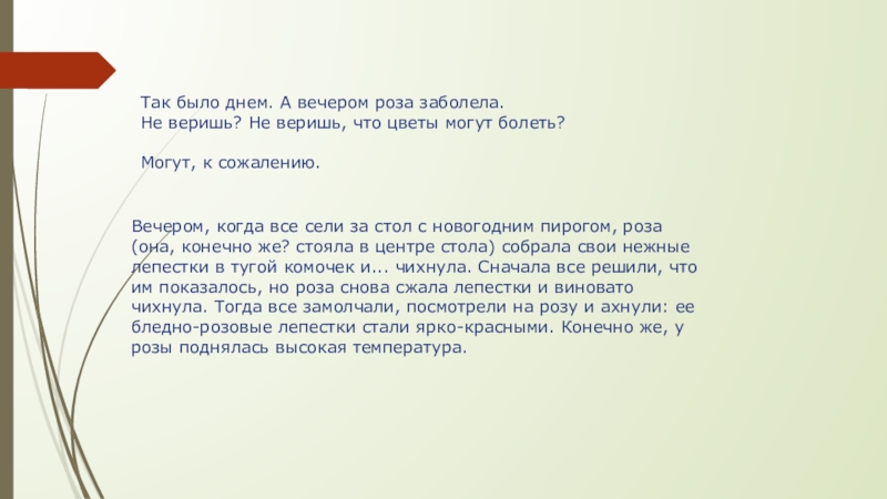 Вечером, когда все сели за стол с новогодним пирогом, роза (она, конечно же? стояла в центре стола) собрала свои нежные лепестки в тугой комочек и... чихнула. Сначала все решили, что им показалось, но роза снова сжала лепестки и виновато чихнула. Тогда все замолчали, посмотрели на розу и ахнули: ее бледно-розовые лепестки стали ярко-красными. Конечно же, у розы поднялась высокая температура.
