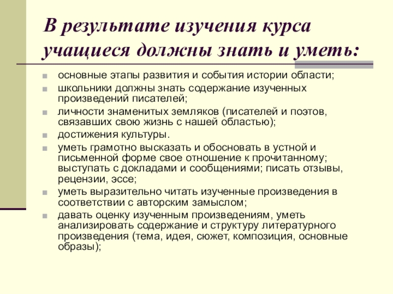Слайд 9В результате изучения курса учащиеся должны знать и уметь: