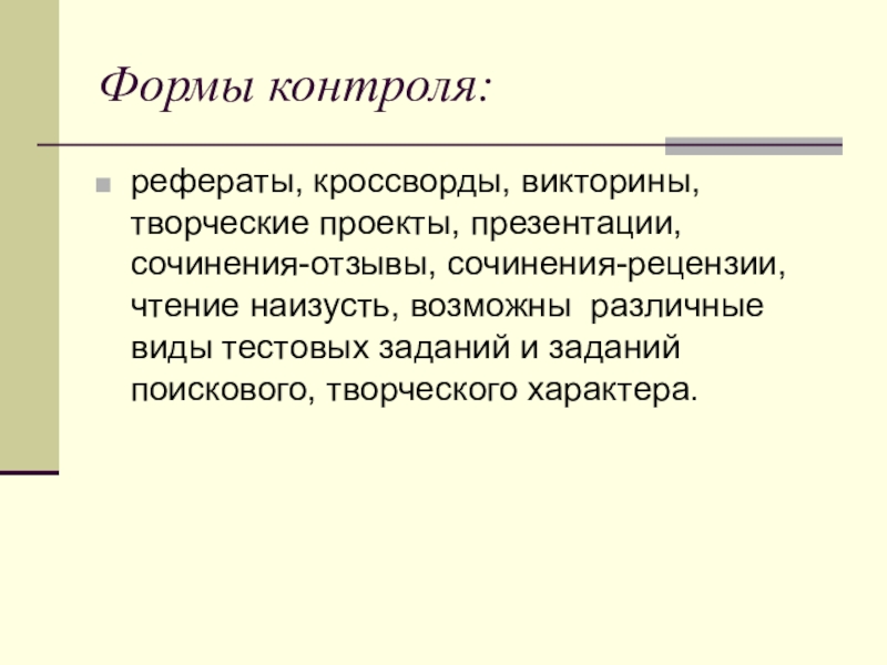 рефераты, кроссворды, викторины, творческие проекты, презентации, сочинения-отзывы, сочинения-рецензии, чтение