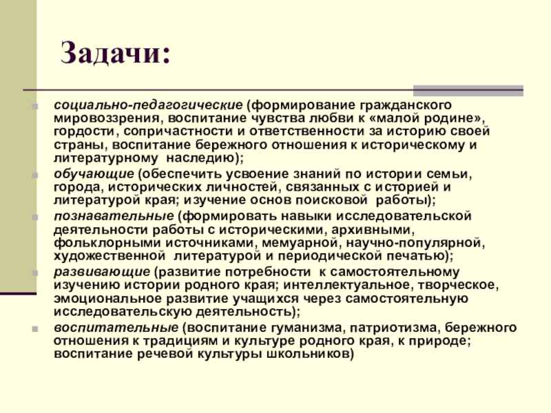 социально-педагогические (формирование гражданского мировоззрения, воспитание чувства любви к «малой родине», гордости,