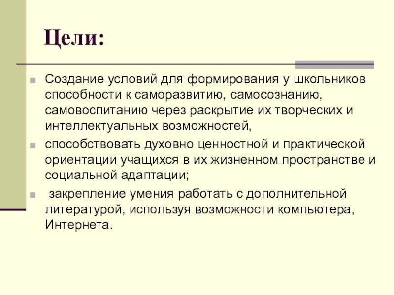 Создание условий для формирования у школьников способности к саморазвитию, самосознанию,