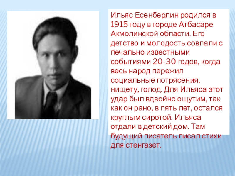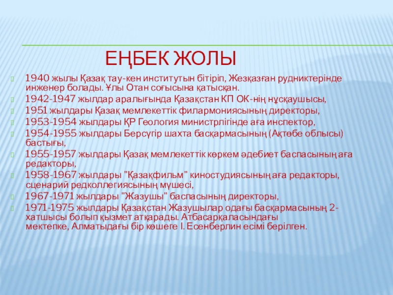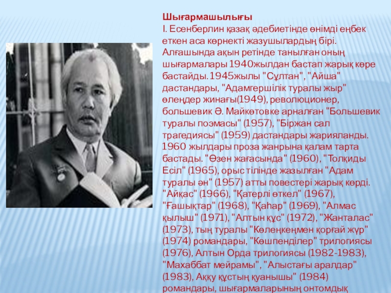 1971-1975 жылдары Қазақстан Жазушылар одағы басқармасының 2-хатшысы болып қызмет атқарады. Атбасарқаласындағы мектепке, Алматыдағы бір көшеге І. Есенберлин есімі берілген.