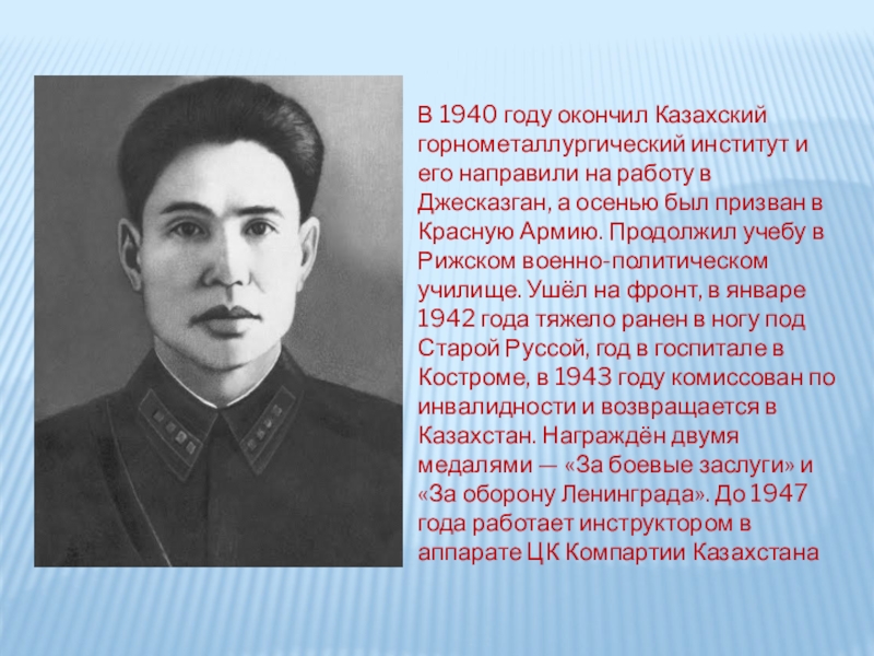 1940 жылы Қазақ тау-кен институтын бітіріп, Жезқазған рудниктерінде инженер болады. Ұлы Отан соғысына қатысқан.