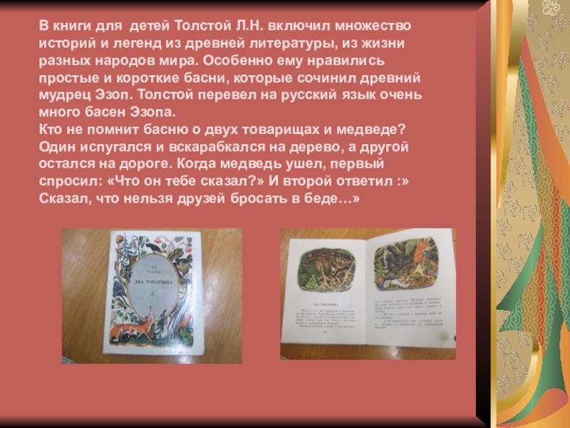 из древней литературы, из жизни разных народов мира. Особенно ему нравились простые и короткие басни, которые сочинил древний мудрец Эзоп. Толстой перевел на русский язык очень много басен Эзопа.